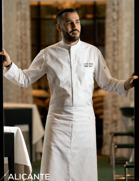 Herren-Küchenjacke , Stehkragen, verdeckte Druckknöpfe, paspelierte Brusttasche, Stifttasche am linken Ärmel, Seitenschlitze. Anpassbares Modell dank des C-YOU-Konzepts. Schaftgewebe mit Ton-in-Ton-Streifen 67 % Polyester 33 % Baumwolle. Nur in langen Ärmeln von T.00 bis 8 erhältlich.